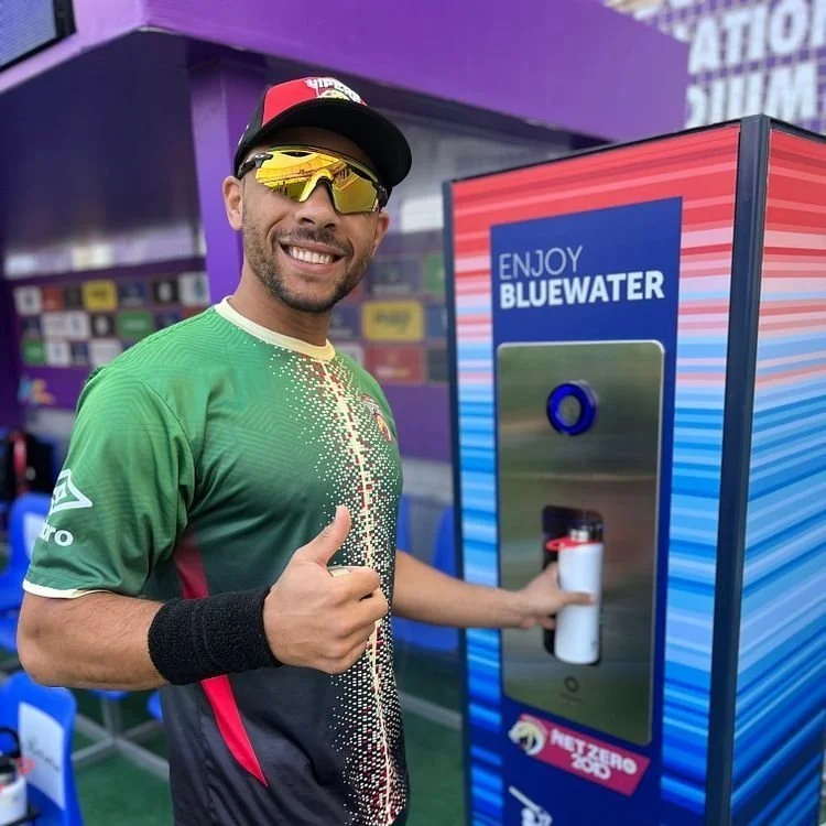 Tymal Mills of Desert Vipers fills his reusable bottle
